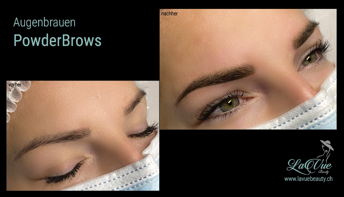 Der Name PowderBrows beschreibt die Technik seht gut. Das Ergebnis sind pudrige Augenbrauen, mit einem verblassten Farbverlauf an der Vorderseite und am Ende einen intensiveren Pigmentierverlauf.